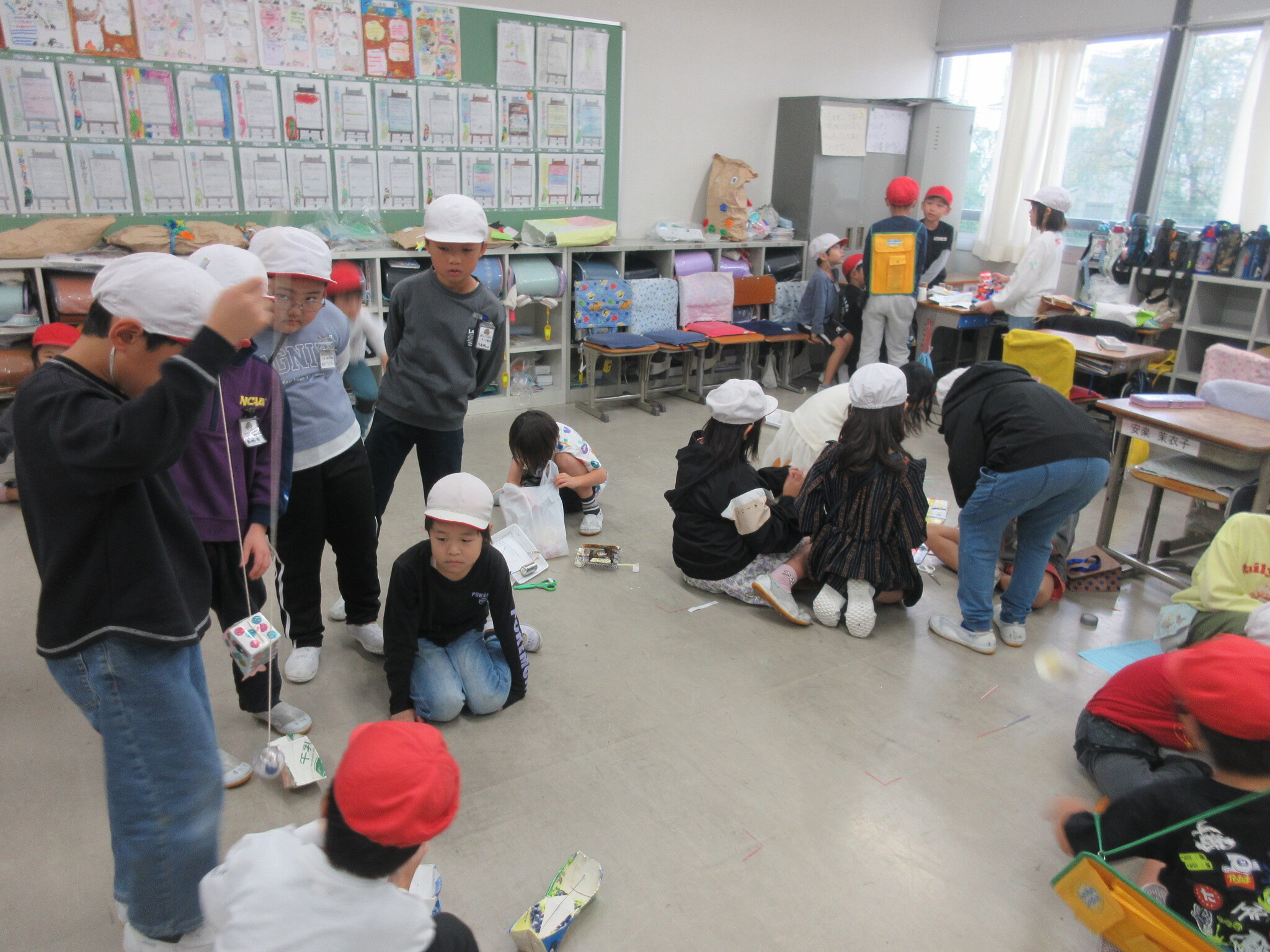 | 10月の様子 自分たちで作ったおもちゃを学年のみんなで試して、いろいろなアドバイスを出し合いました。おもちゃランド本番では、1年生も楽しめるように、みんなで工夫を重ねています。 | |