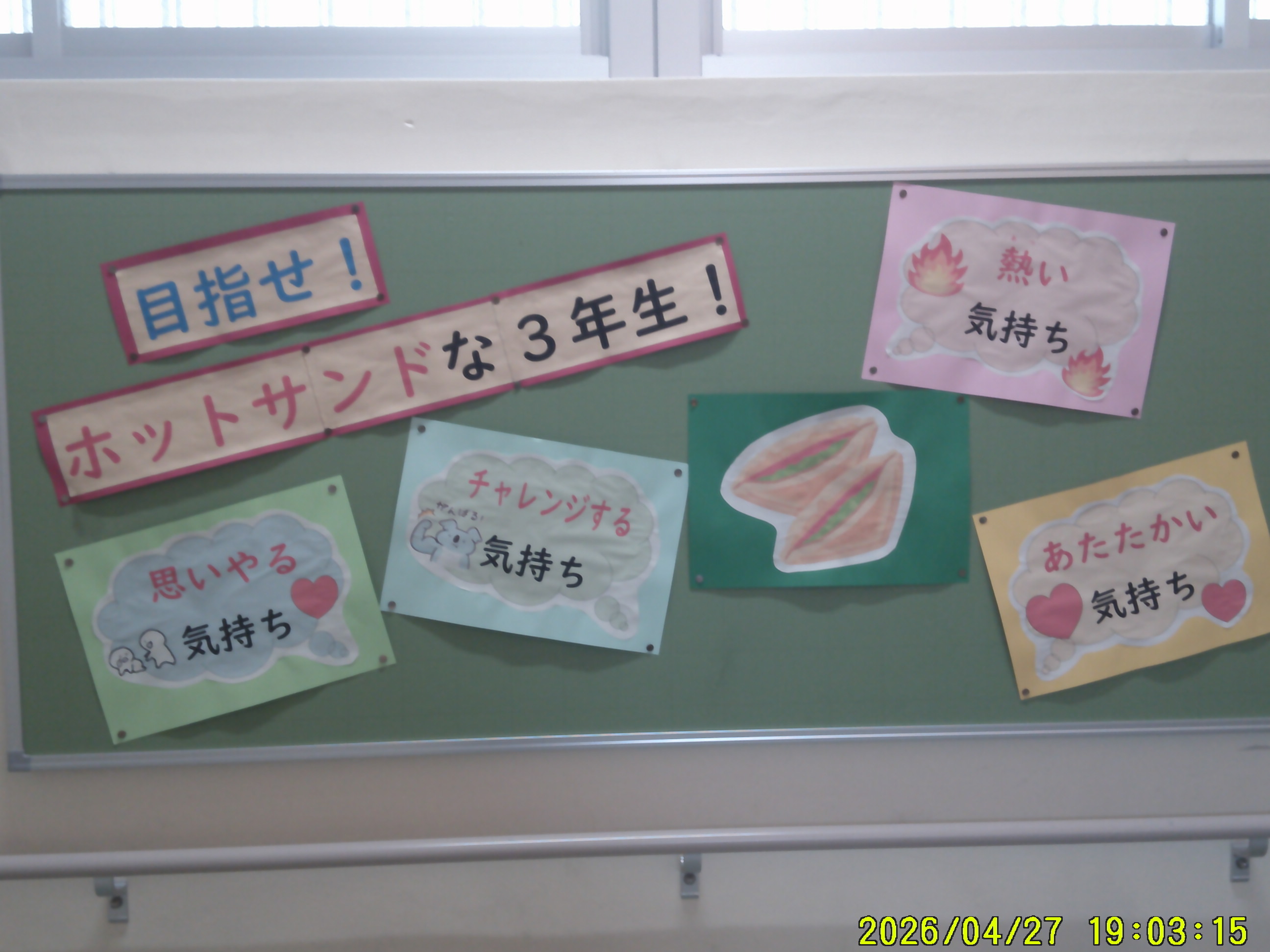 3年生の学年目標は、「ホットサンド」です。「思いやりや笑顔」の「ほっと」、「チャレンジや自分から行動する」の「ホット」、「3年生一人ひとりの違いを生かして大きな力を生み出す」の「サンド」、3つの意味が込められています。2日目の学年集会で子ども達と共有しました。1年間、ホットサンドを目指して活動していきます。