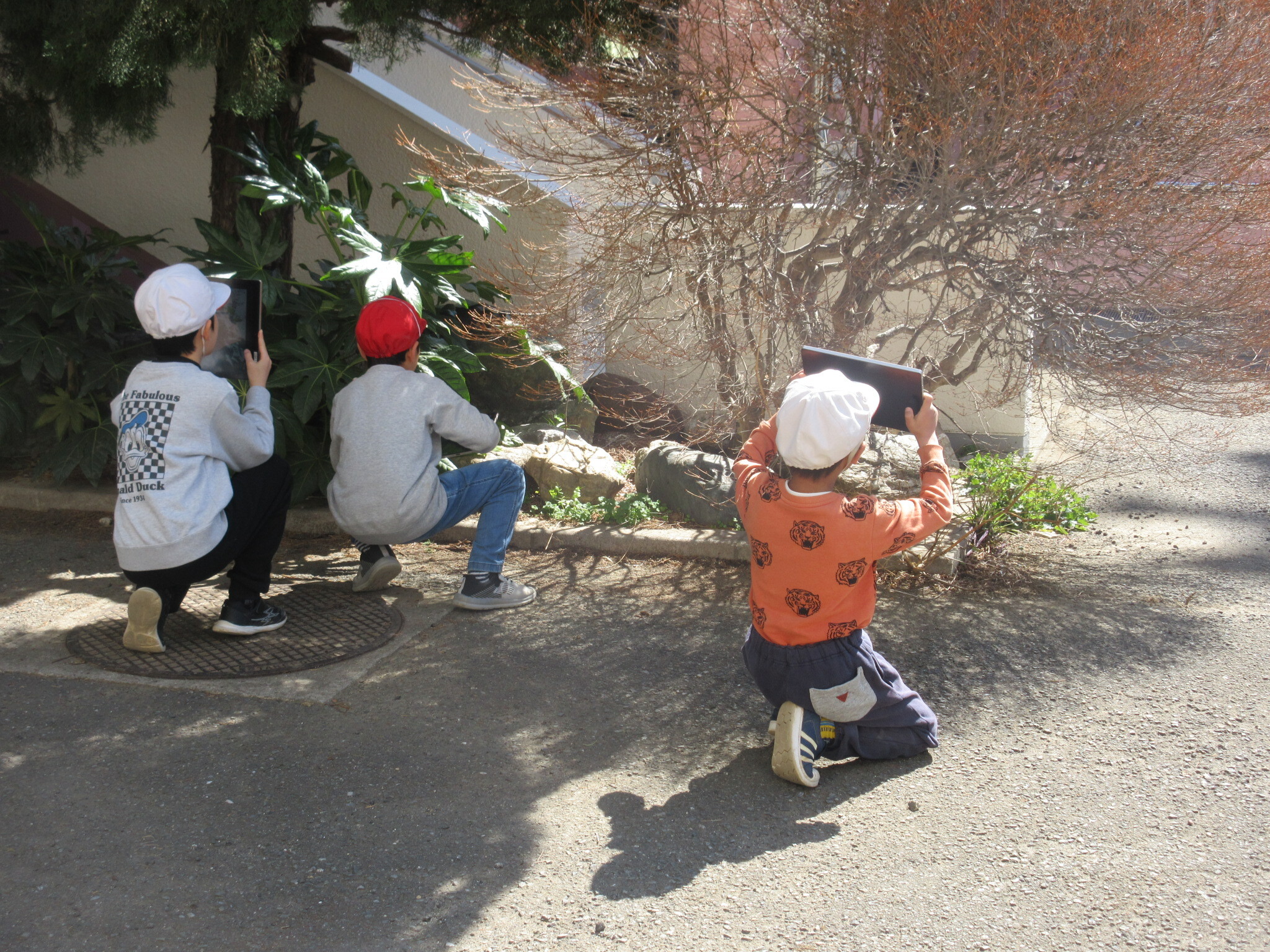 3月の様子 STEAMS TIMEの学習でフォトグラファーの仕事に挑戦しました。タブレットで様々な場所を探検しながら写真を撮りました。影に注目しながら、面白い表現をしようと試行錯誤する姿が見られました。 |