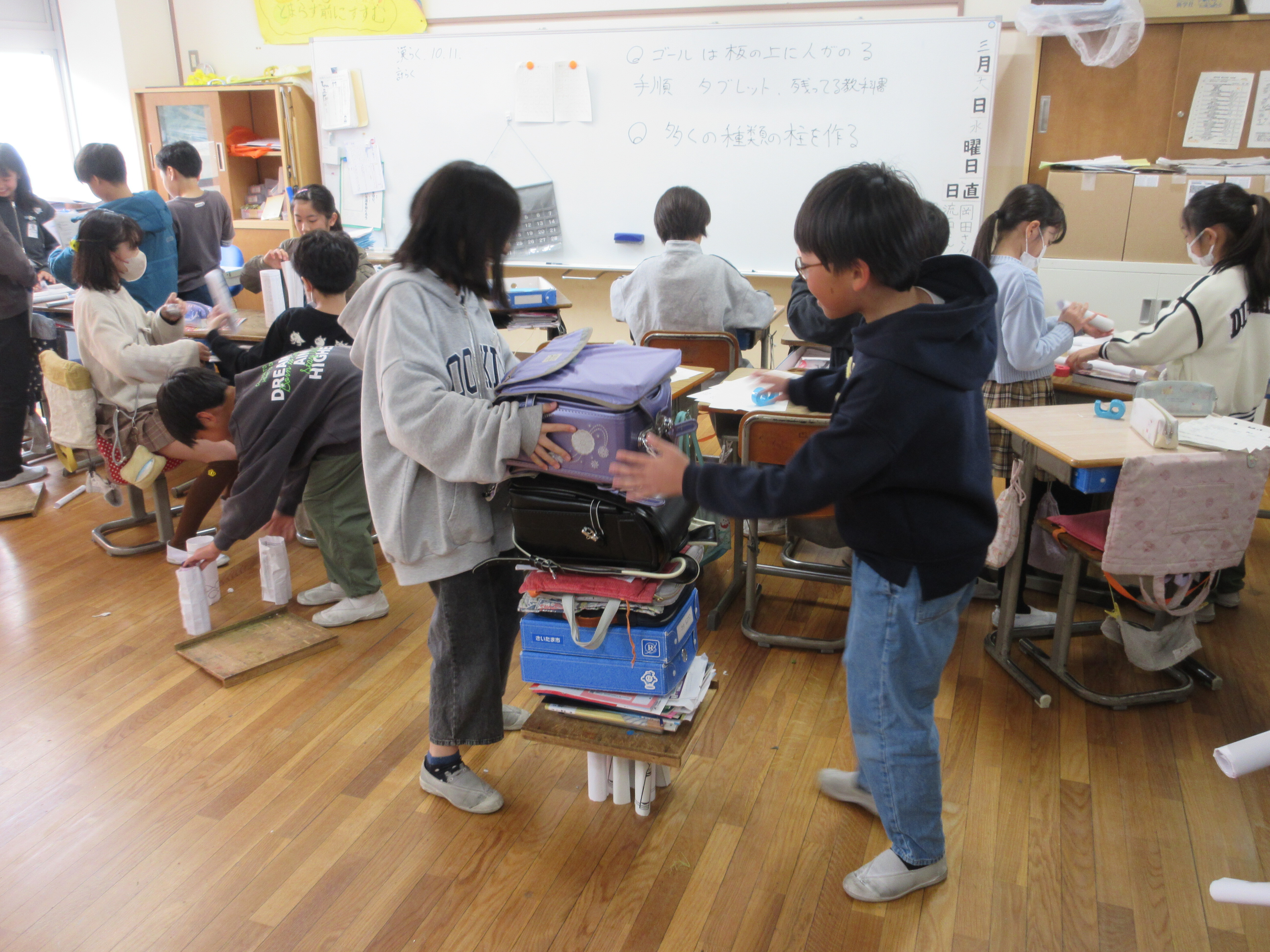 STEAMS TIMEの「じょうぶな柱を作ろう」の学習では、紙の重ね方や折り方を工夫して、試行錯誤しながら丈夫な柱の作り方を考えました。 |