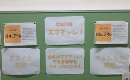 毎月、学年目標「スマチャレ(スマイル&チャレンジ)」の振り返りを行っています。前月(9月)は自然の教室があったためか、初めてチャレンジ度の数値が80%を超えました。困難なことにも挑戦できたと感じた児童が多かったようです。最高学年まであと半年!チャレンジ精神を大切にしてほしいです。 |