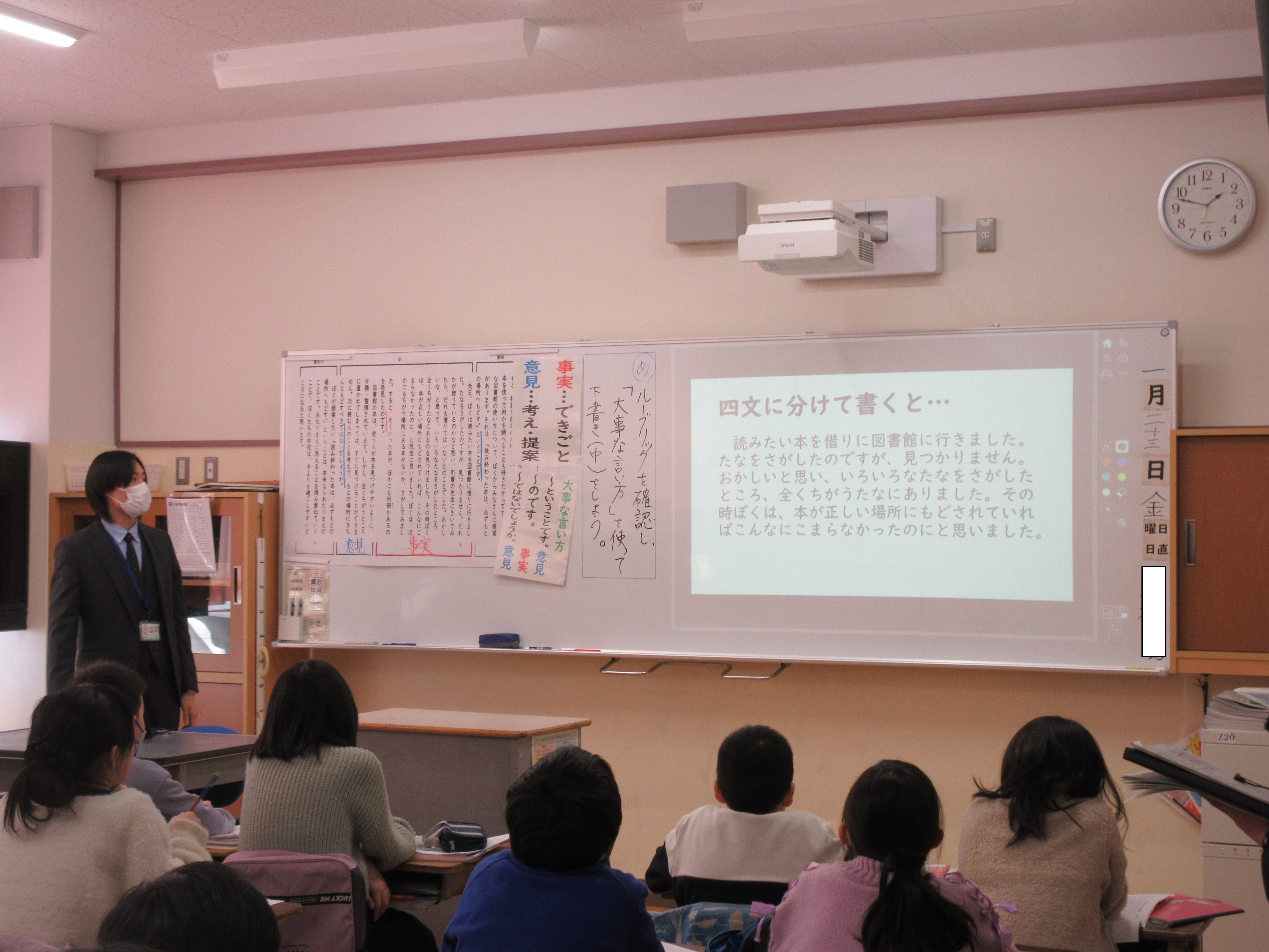 5年生で国語の研究授業が行われました。教材は「生活をよりよくする提案」です。最高学年に向けて意識を高めることを目的に、事実と意見を結び付けて提案文を書く活動を行いました。一人ひとりが目標を設定したり、互いに教え合ったりする姿が見られました。